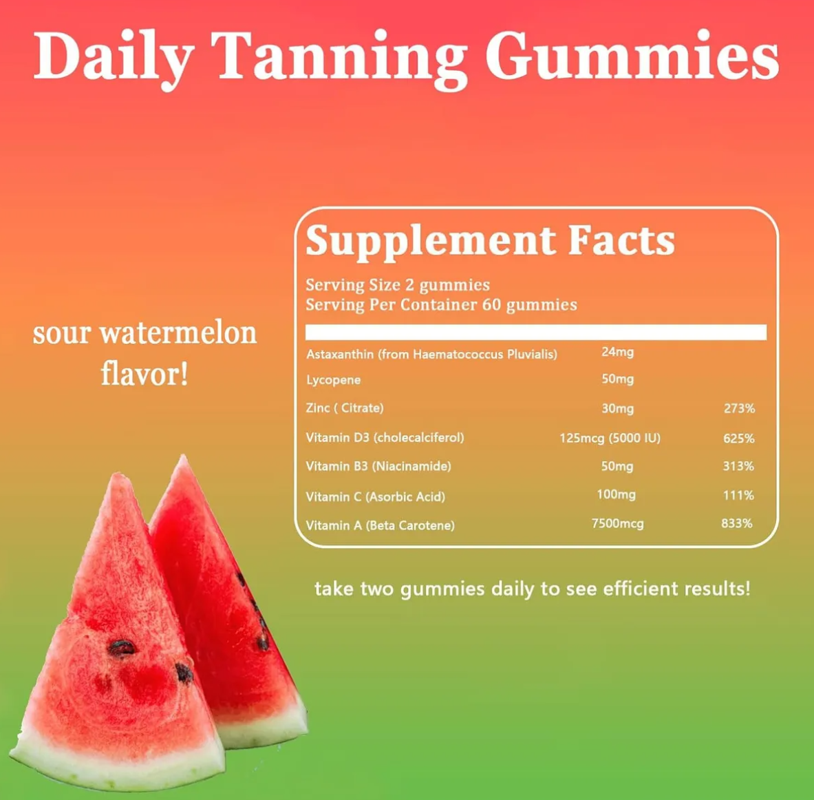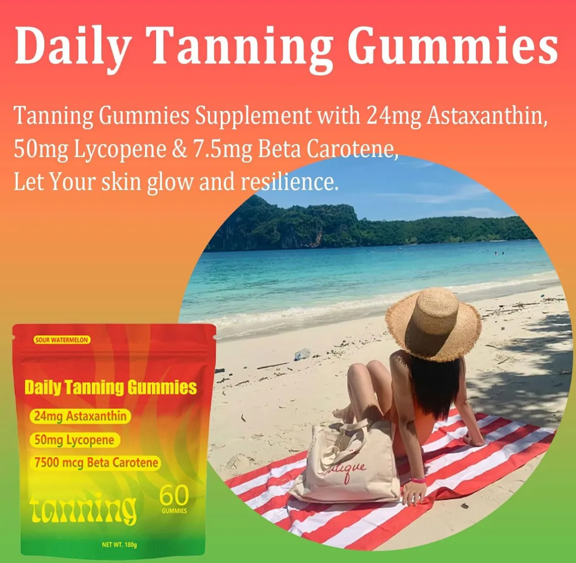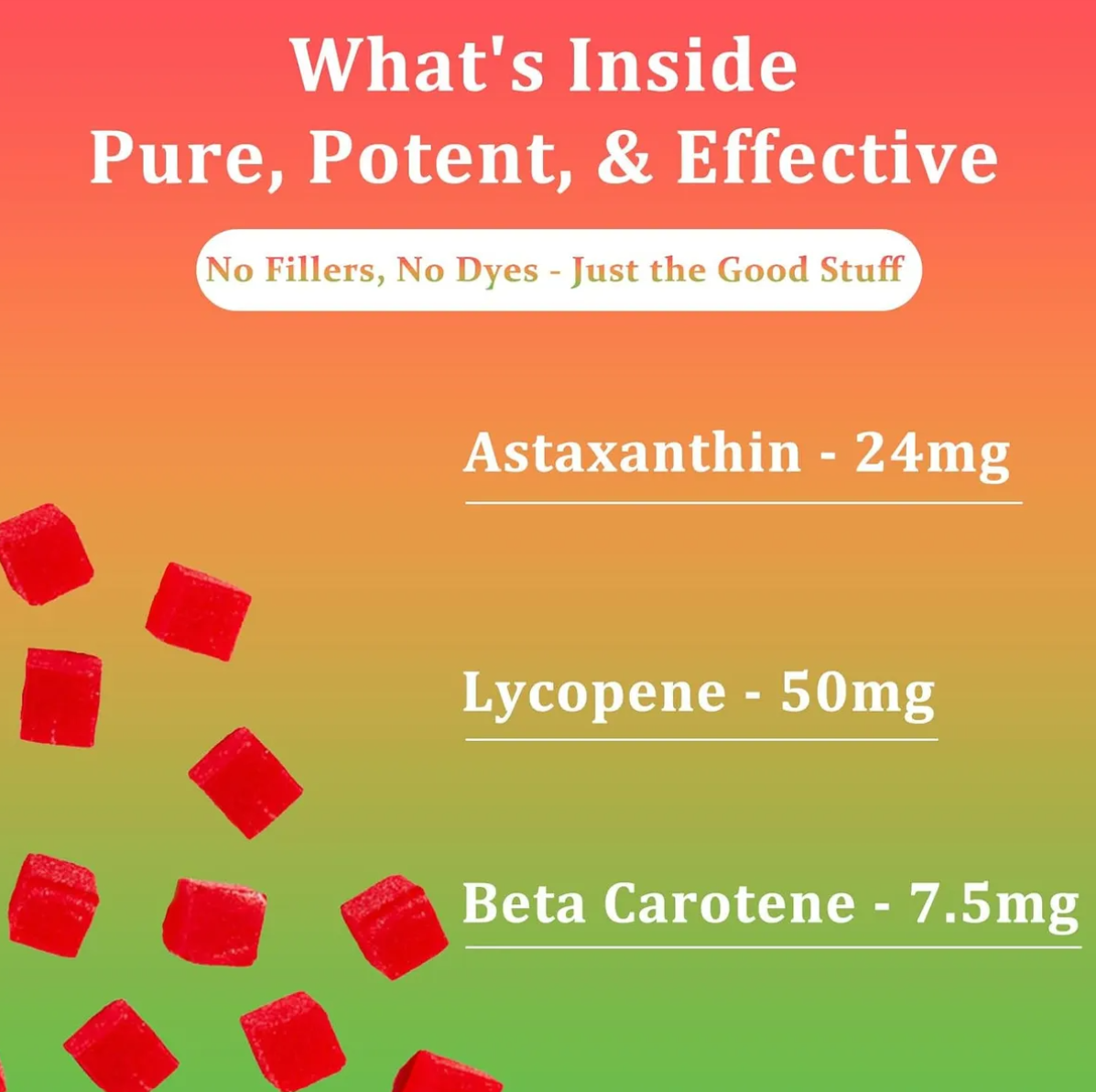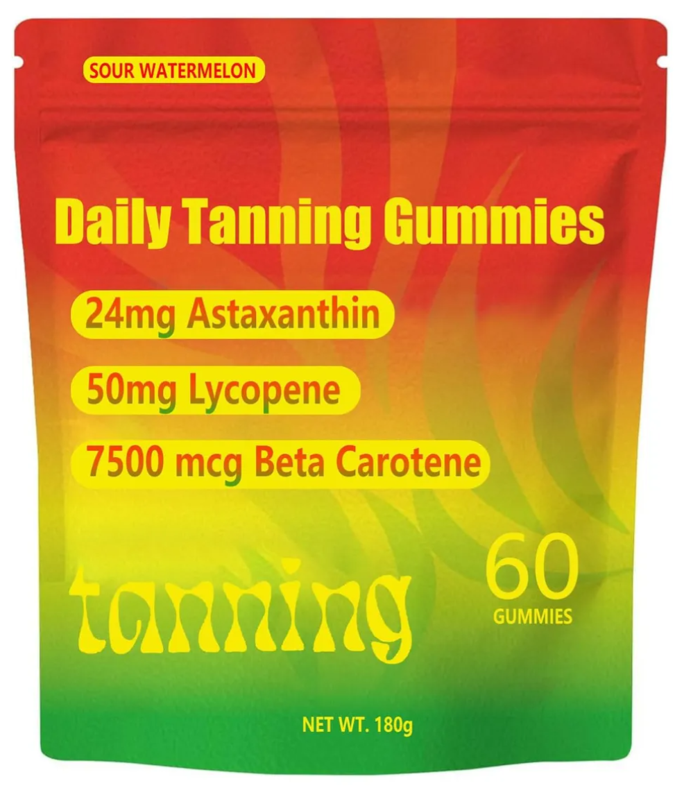 Suplemento de gomitas bronceadoras de fórmula natural con 24 mg de astaxantina, 50 mg de licopeno y 7,5 mg de betacaroteno.