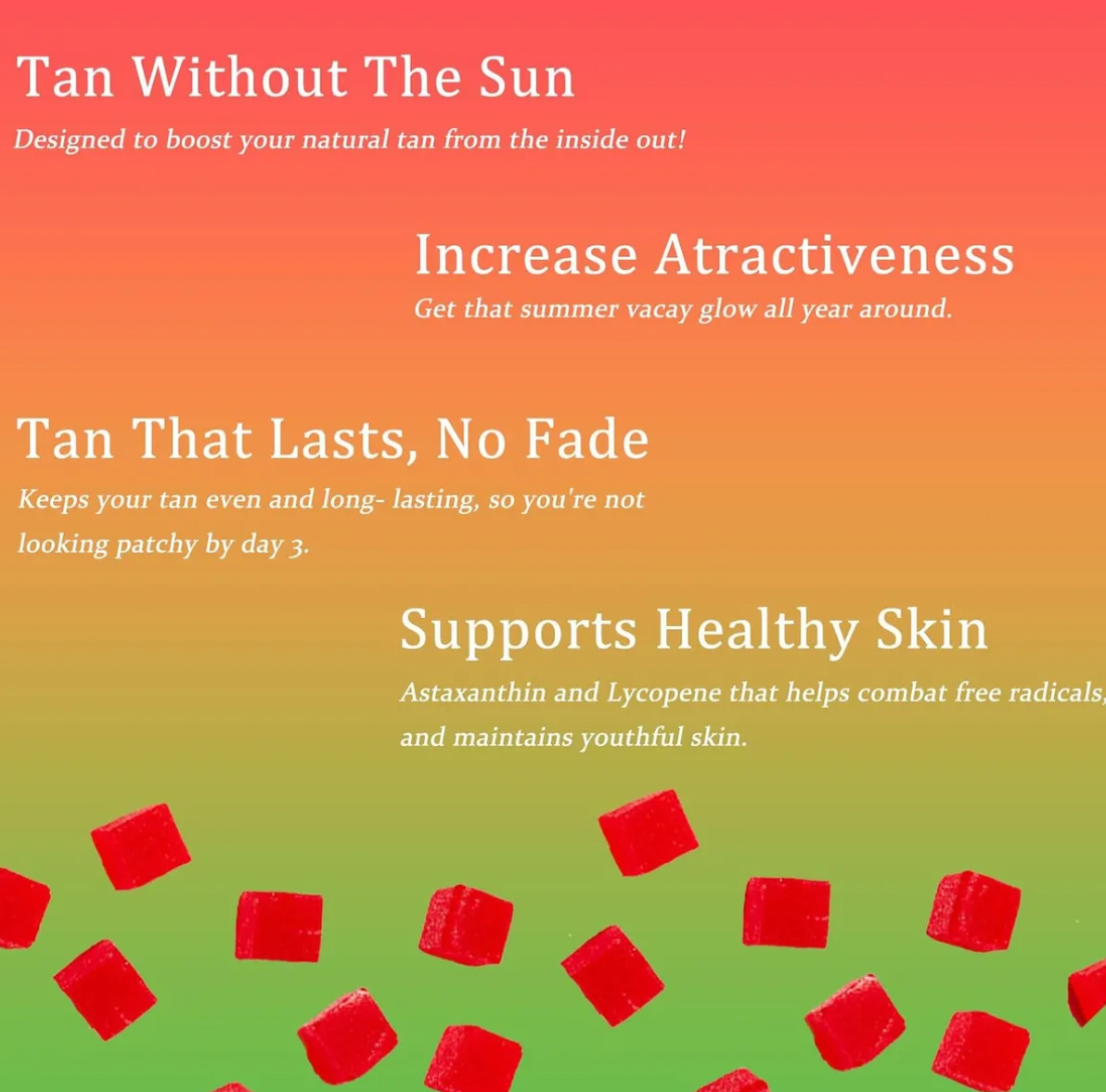 Efecto notable: resultados radiantes en tan solo 2 semanas. Gomitas bronceadoras: realzan el color con un tono uniforme.