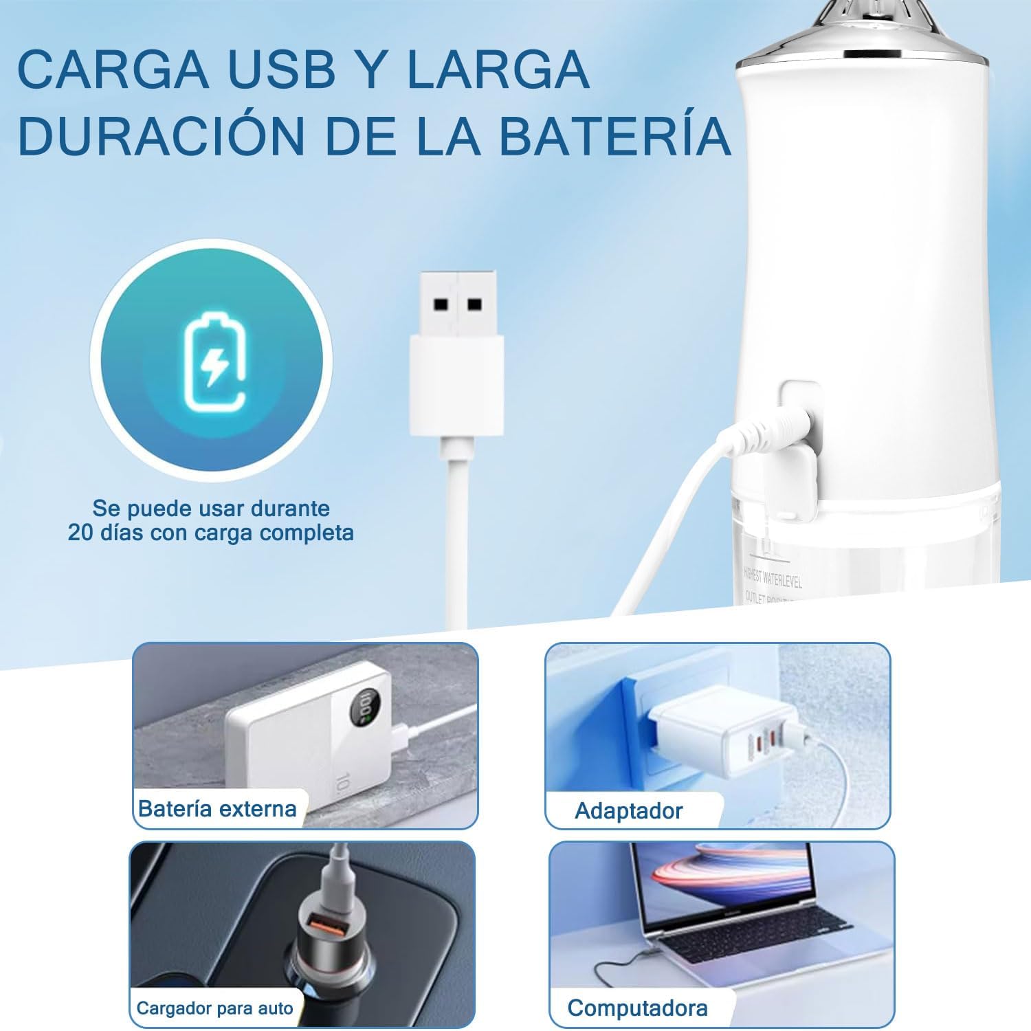 • [Potente Batería con Cable de Carga USB]: Irrigador dental tiene una batería incorporada de gran capacidad, que puede ser utilizado durante casi 20 días cuando está completamente cargada, que puede lograr una carga rápida, sólo tarda 3-4 horas en cargarse. Nuestro cepillo de dientes está diseñado para ser pequeño y flexible, y es muy cómodo de llevar, es ideal para viajar o salir.