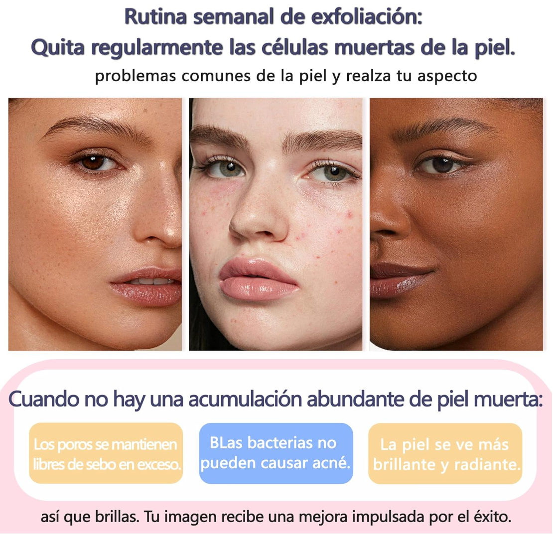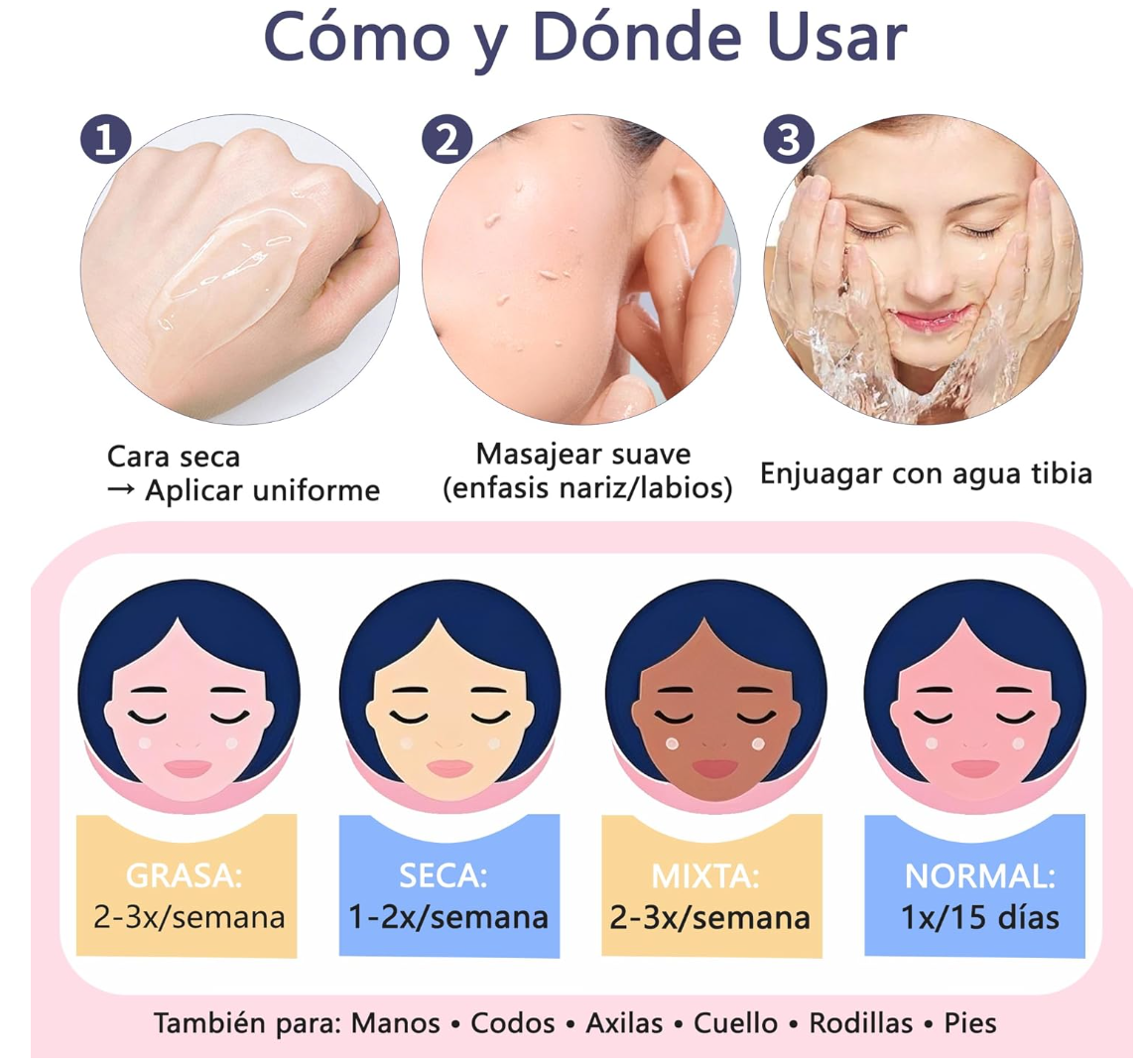 Para todo tipo de piel y uso versátil: No solo es un exfoliante facial, sino también un exfoliante corporal perfecto para areas como los pies (exfoliante para pies). Su fórmula suave se adapta a cualquier tipo de piel, incluyendo la más sensible, y se puede integrar con tu crema facial habitual para resultados aún mejores.